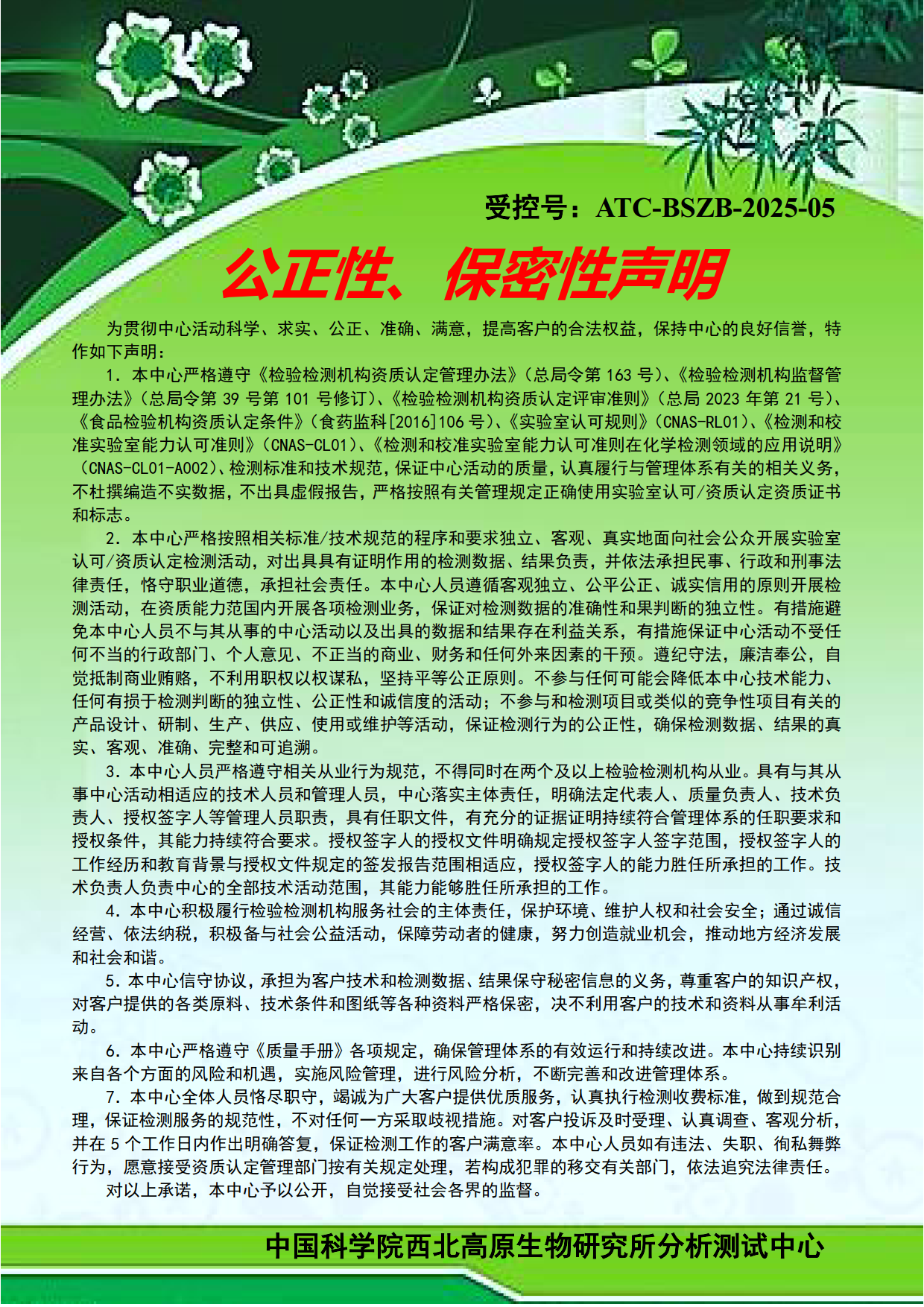 为贯彻中心活动科学、求实、公正、准确、满意,提高客户的合法权益,保持中心的良好信誉,特作如下声明: