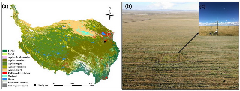 图1 (a)研究区在青藏高原的地理位置;(b)涡度相关系统在垂穗披碱草草地的布设位置;(c)涡度相关观测系统实物图。