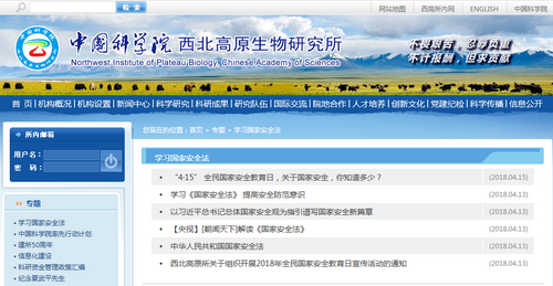 结合中科院西北高原生物研究所实际情况,所办公室在网站主页增设浮动窗口,专题链接国家安全法有关内容;下发通知.开展在线学习2017年《求是》杂志第8期文章《以习近平总书记总体国家安全观为指引,谱写国家安全新篇章》(署名钟国安);组织科研人员和研究生收看中央电视台“4.15”特别节目。